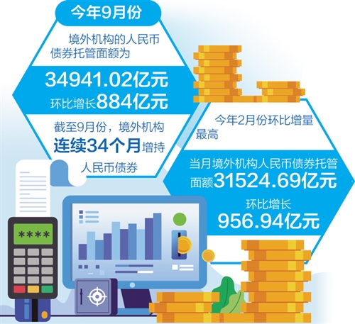 境外机构对人民币债券热情持续高涨。数据显示,9月份境外机构人民币债券托管面额为34941.02亿元,较8月份增加884亿元,环比增量创今年3月份以来新高。截至9月份,境外机构已连续34个月增持人民币债券。