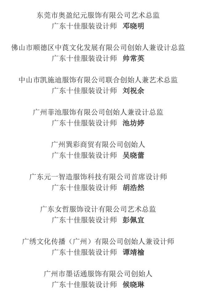 广东省服装设计师协会领导:会长计文波,党支部书记丁宁,执行会长黄瑛,专职执行会长温静华,专职执行副会长王珈,常务副会长李小燕、邓兆萍、金憓、周世康、林进亮,副会长王培娜、董怀光、赵亚坤、何建华、蔡蕾、江平、陈季红、 孙贵填、齐立良、卓其满、阮国行、龚曦、韩银月,监事长禤穗明,监事张丹丹。