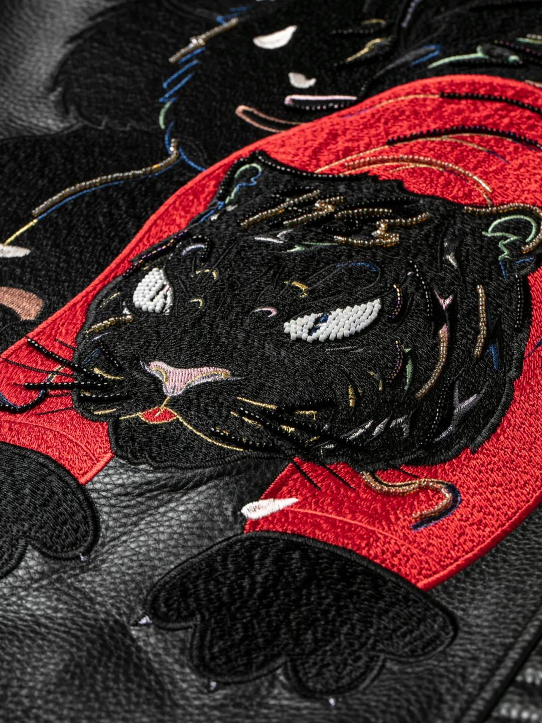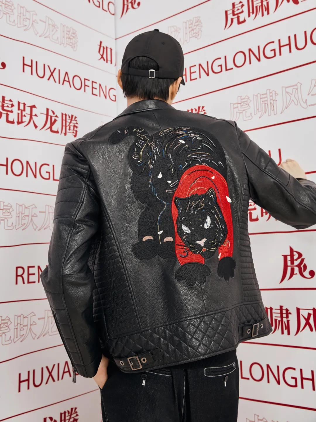 16万针、6小时手工绣制,重工刺绣皮茄克——前胸和后背均采用了刺绣与手工串珠工艺。后背的整只滴水兽虎更是采用16万针重工工艺,每一个刺绣片总耗时需要6个小时纯手工匠制的刺绣图案,经过特殊工艺处理后,廓形硬挺但触感柔和,让整件茄克刚中带柔。