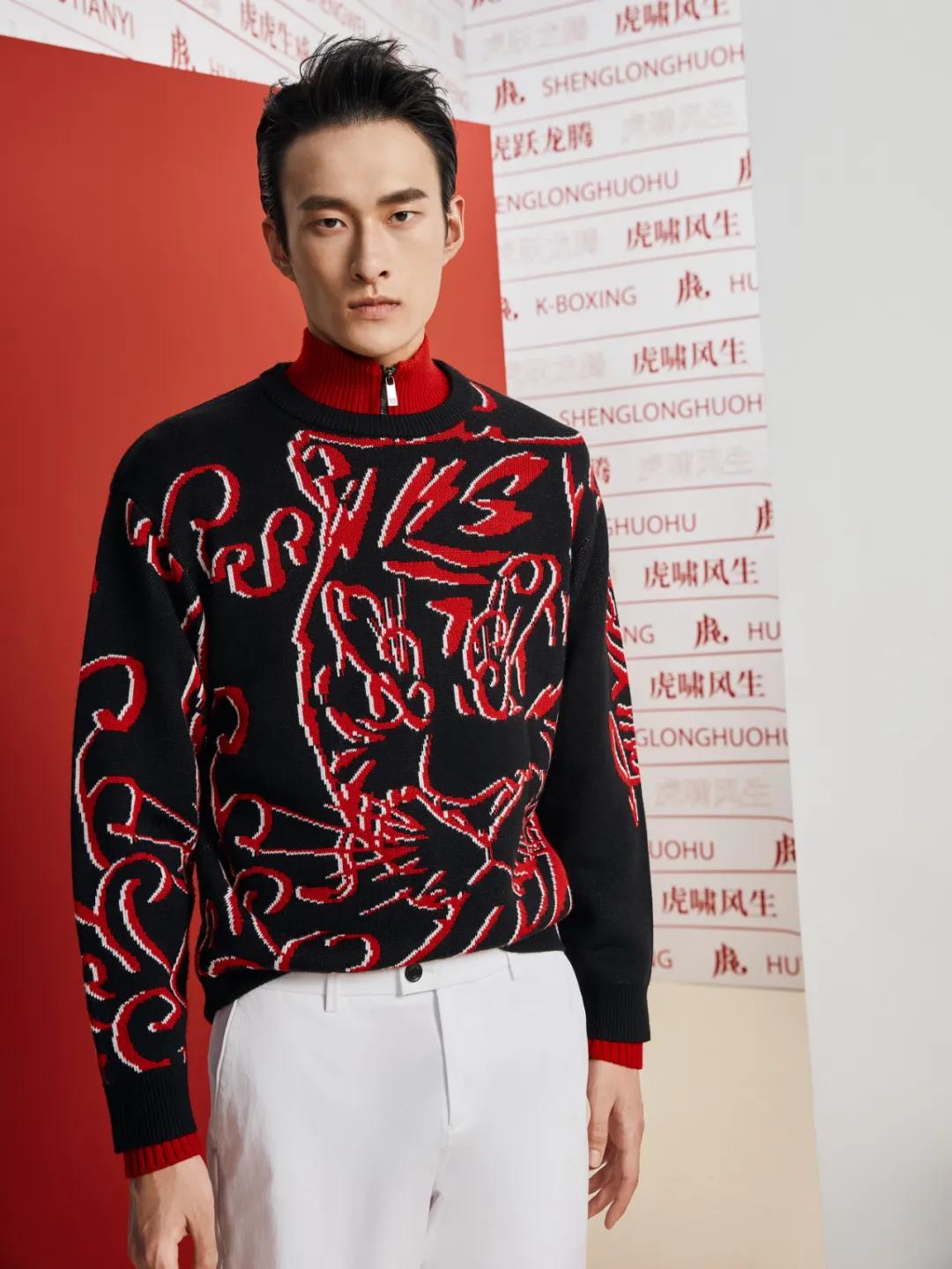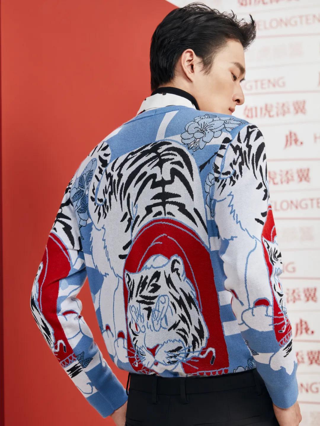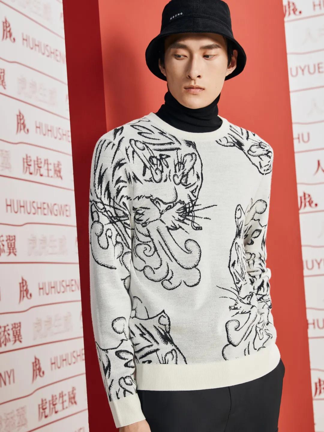 大图案提花粗针毛衫——灵活采用粗针织法,运用织造难度非常高的大图案提花和左右不对称设计手法展现滴水兽虎灵韵,传统节日的着装风格依然时尚感十足。