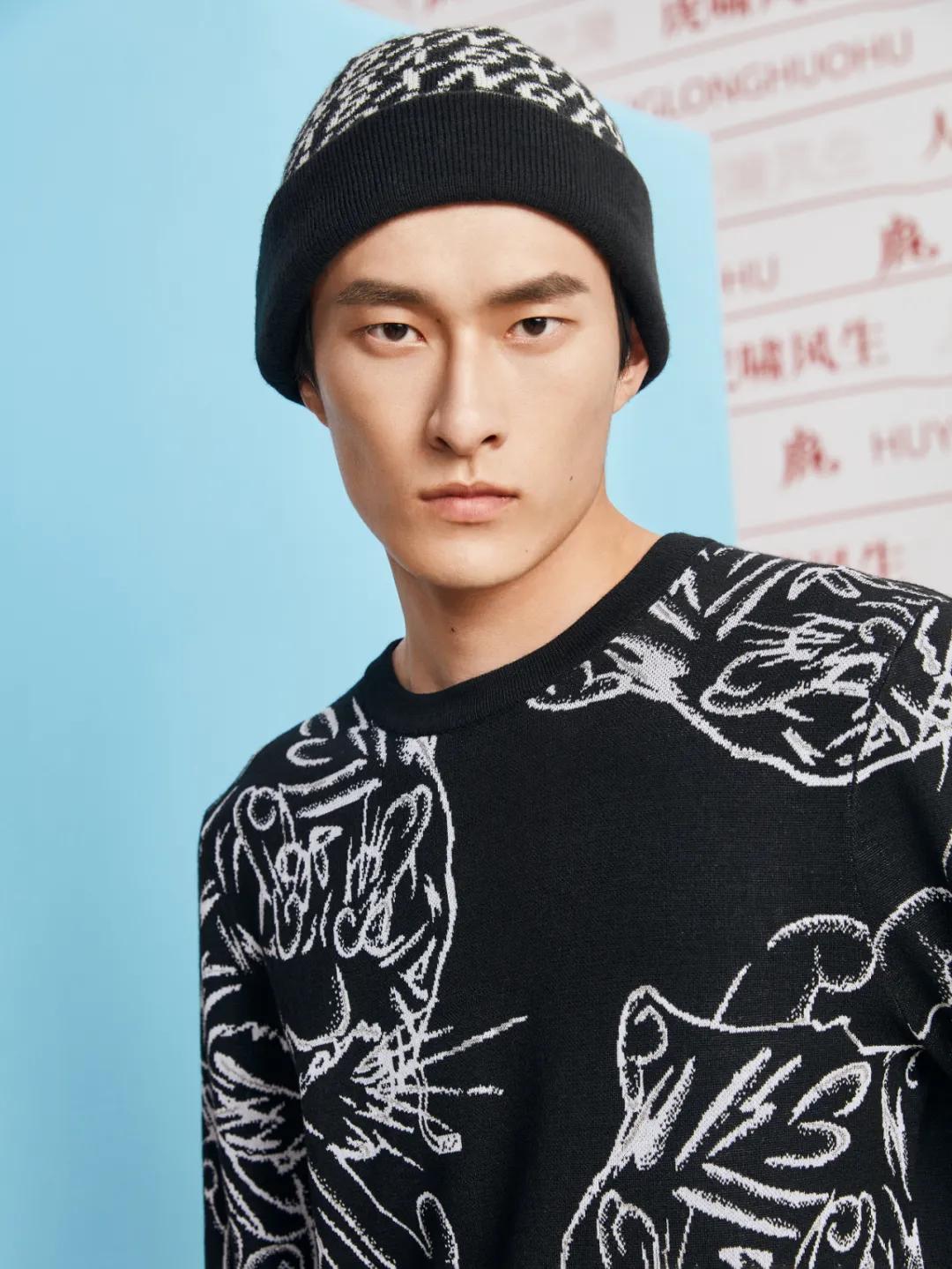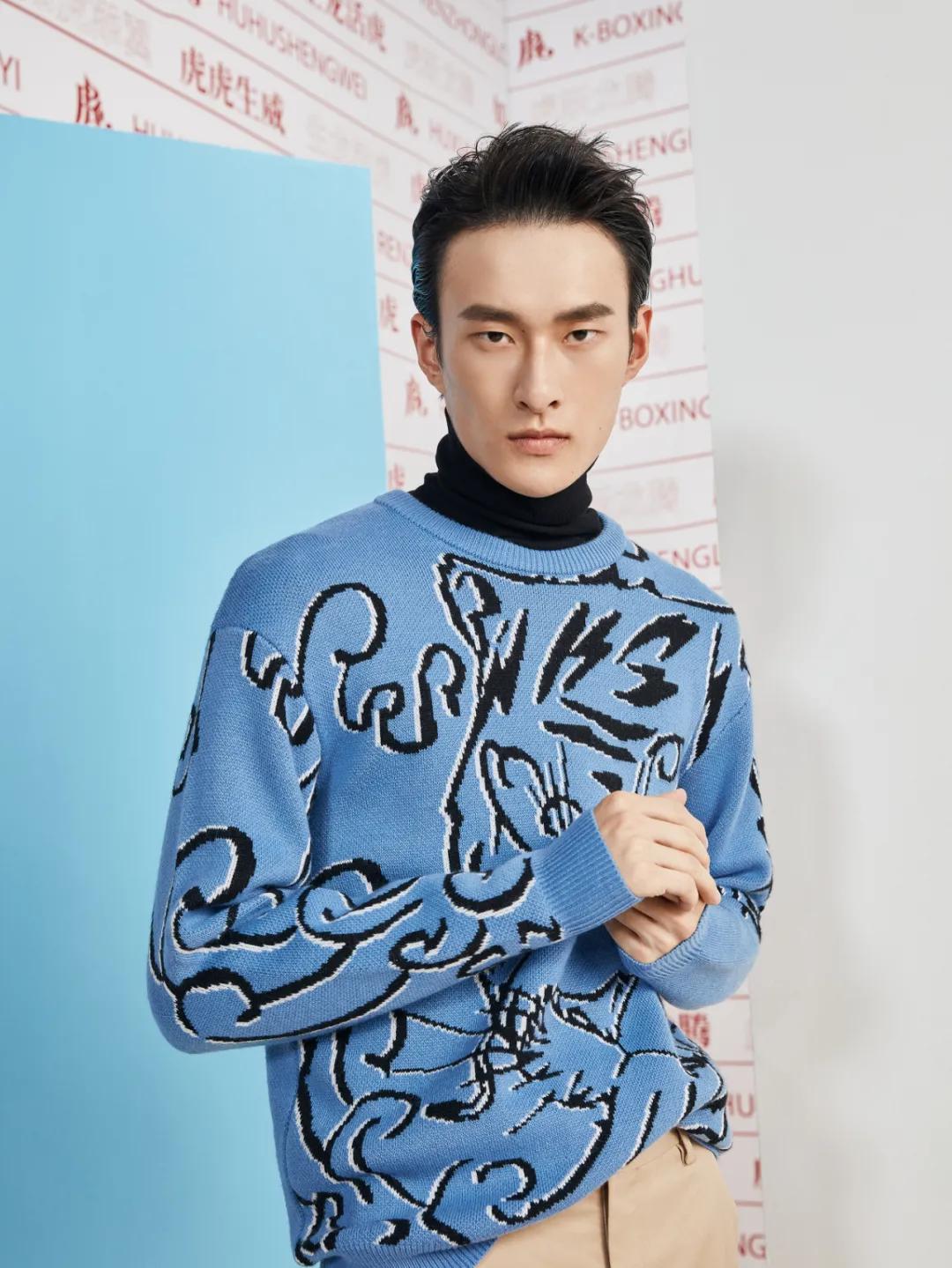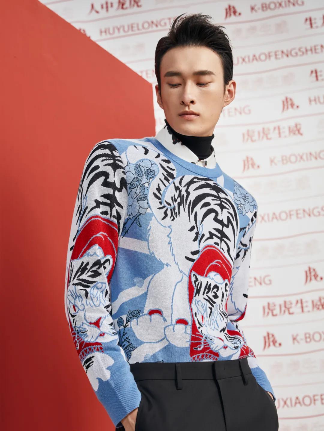 大图案提花粗针毛衫——灵活采用粗针织法,运用织造难度非常高的大图案提花和左右不对称设计手法展现滴水兽虎灵韵,传统节日的着装风格依然时尚感十足。