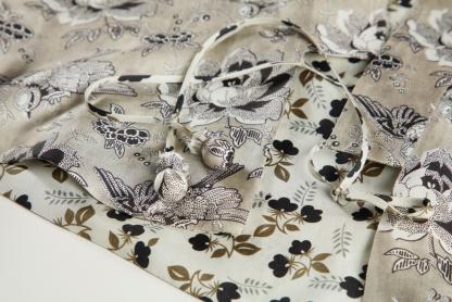 爱极宋朝极简美学的严芳妮,崇尚素净灵魂,喜欢朴素而不多一物的表达,她用减法做服装,将不必要的一一减掉,只留下最需要关注的本质,认为过多的表现是对设计最大的伤害;但该有的细节却尽精微“一点也不能少”,绲边、藏线迹、内止口来去缝合、盘扣等工艺、她喜欢用热爱的书法来打比方“衣服和书法有很多异曲同工之处,好的字一定是中宫收紧,结构分明,气韵和谐,洁净精微……有一处没表达好,就影响整个字了”。她更愿意称自己是手工艺师,在一针一线,一点一划的细碎中,一珠一穗,一褡一袢顺手拈来,通过手将触觉、视觉、感觉和服装去相协调,用朴素而温暖的手工手艺赋予服装以灵魂,在设计的广度和精准度里玩味服装的韵味,小中见大,如切如磋,如琢如磨……