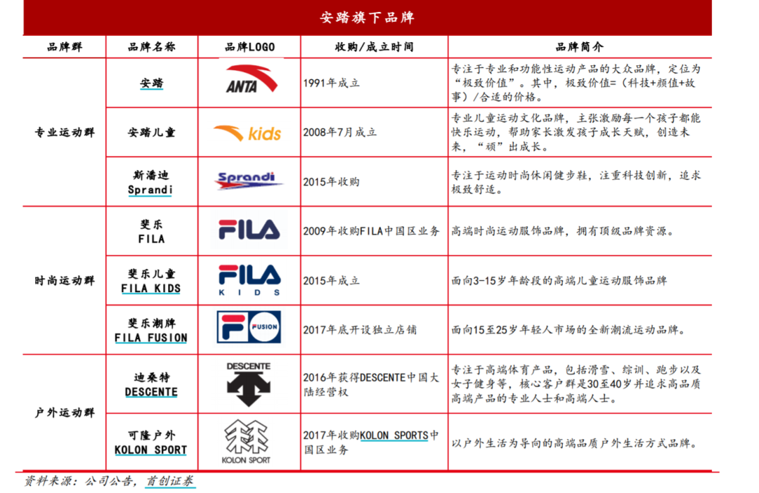 安踏通过并购、参股等方式形成了品牌矩阵。旗下品牌还有萨洛蒙(Salomon)、始祖鸟(Arc'teryx)、阿托米克、kolon等。这些品牌构成了专业运动、时尚运动、户外运动三大差异化品牌群。
