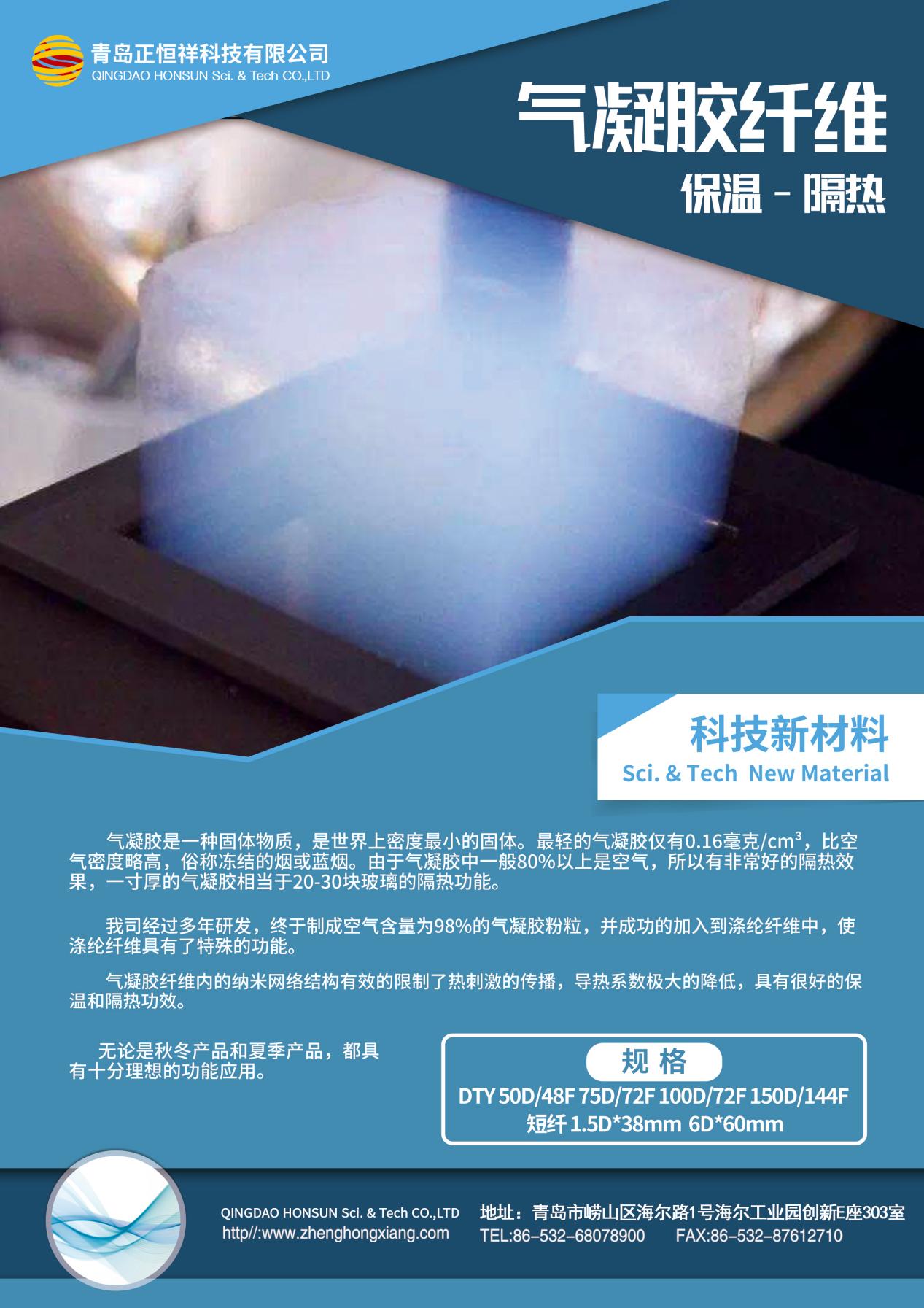 青岛正鸿祥科技有限公司生产的气凝胶纤维是将二氧化硅气凝胶研磨成超细粉末,然后与聚酯结合,生产出的一种新型功能性纺织纤维。同理,将硅基气凝胶粉末与聚酯结合生产出来的就是聚酯气凝胶纤维;将气凝胶粉末与纤维素结合生产出来的就是纤维素气凝胶纤维……