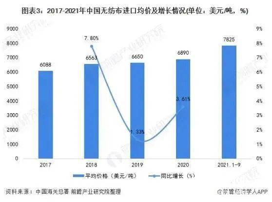 /吨,;2021年前三季度,我国无纺布进口均价涨至7825美
