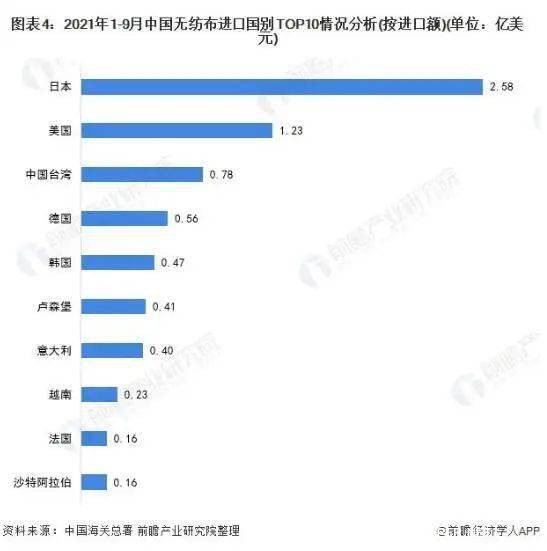 从我国无纺布制品进口国别来看,2021年1-9月,我国无纺布主要从日本进口,进口额高达2.58亿美