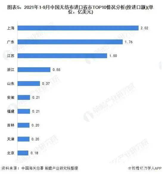 ,位居第一;其次是广东和江苏,无纺布进口金额分别为1.76亿美