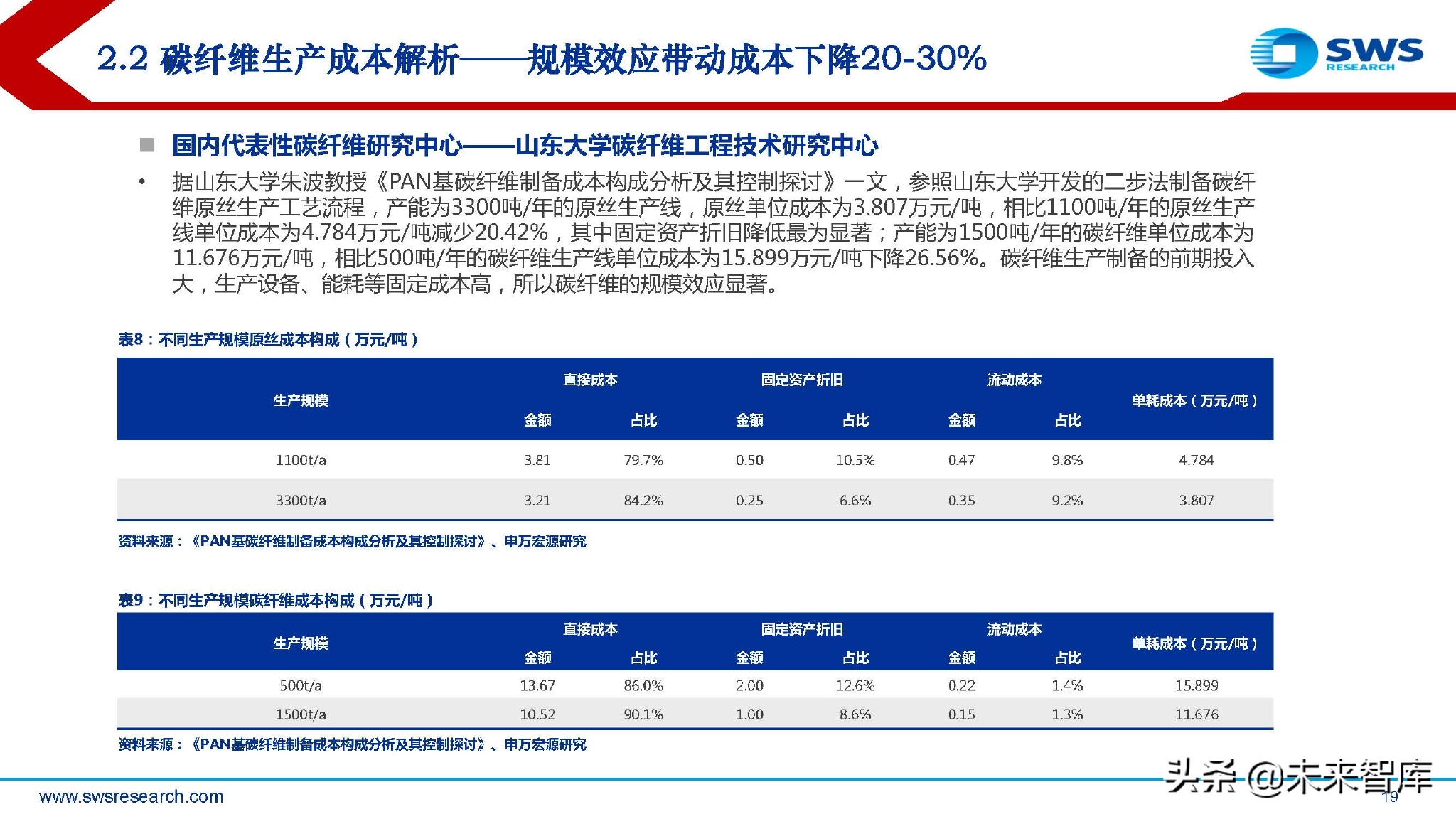 国内代表性碳纤维研究中心——山东大学碳纤维工程技术研究中心 。参照山东大学开发的二步法制备碳纤 维原丝生产工艺流程,产能为3300吨/年的原丝生产线,原丝单位成本为3.807万元/吨,相比1100吨/年的原丝生产 线单位成本为4.784万元/吨减少20.42%,其中固定资产折旧降低最为显著;产能为1500吨/年的碳纤维单位成本为 11.676万元/吨,相比500吨/年的碳纤维生产线单位成本为15.899万元/吨下降26.56%。碳纤维生产制备的前期投入 大,生产设备、能耗等固定成本高,所以碳纤维的规模效应显著。
