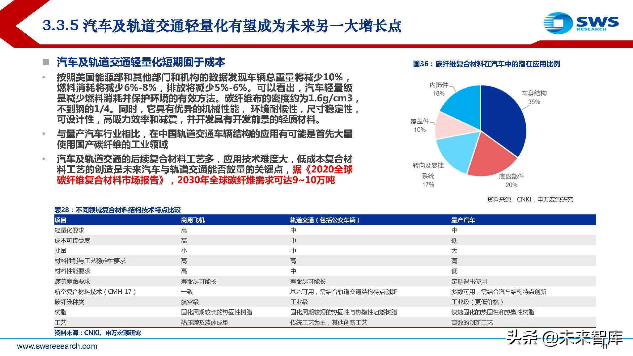 历史上东丽预测2020年碳纤维行业需求达到14万吨,但实际上2020年全球需求约10.69万吨,即使考虑2020年开始的疫情 对各领域需求的影响,东丽当年对行业需求的估计仍显乐观。 尽管如此,我们并不怀疑未来行业需求的空间,我们认为随着中国碳纤维生产能力与成本的赶超,叠加上下游产业链配套 (主要是复合材料创新工艺与成本下降),碳纤维行业下游需求有望加速扩张。