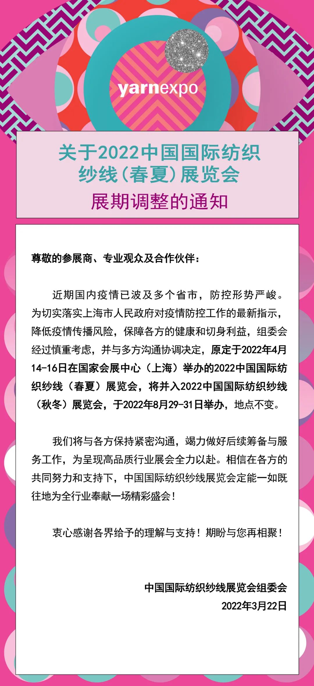 关于2022中国国际纺织纱线(春夏)展览会展期调整的通知