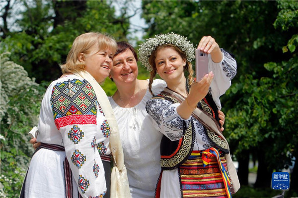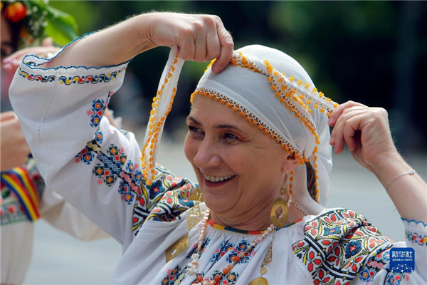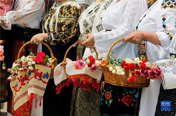 5月8日,在罗马尼亚首都布加勒斯特,身穿传统服装的女士们参加民族服装日活动。