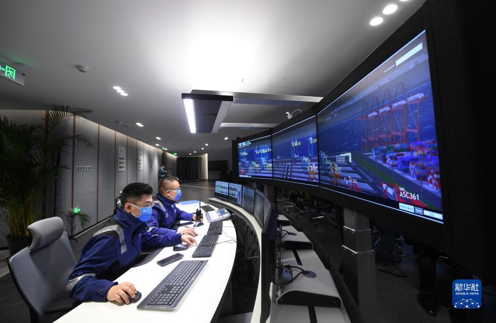 工作人员在天津港北疆港区C段智能化集装箱码头智控中心内监控码头作业状态(2021年10月17日摄)。新华社记者 赵子硕 摄