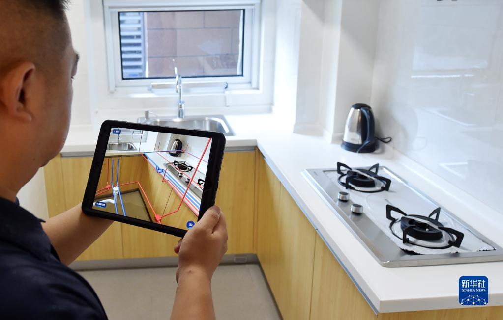 在中新天津生态城一小区,小区业主通过AR房屋使用说明书查看厨房管道线路(2020年8月13日摄)。新华社记者 赵子硕 摄