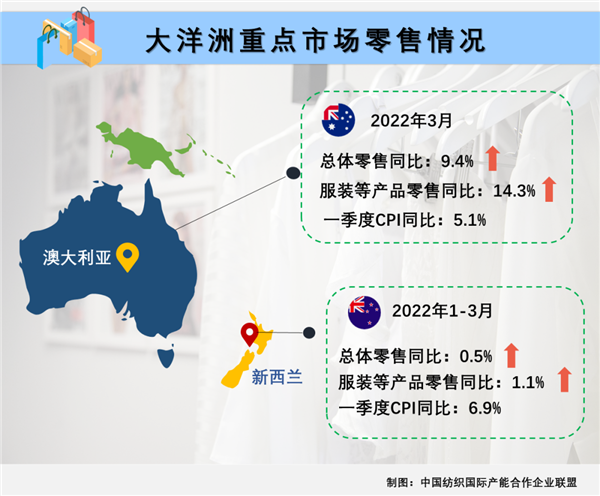 新西兰一季度CPI为6.9%,同比涨幅创30年来新高。今年前3个月其市场总体零售额同比微增仅0.5%,服装、鞋类和配饰零售额11.7亿新元(约7.6亿美元),同比增长1.1%。