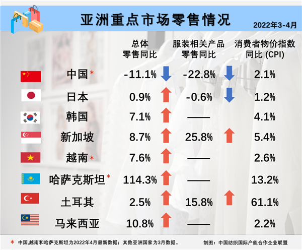 和欧美地区相比,亚洲主要零售市场的通胀水平保持了相对平稳态势。3至4月,除中国市场外,亚洲其他各国服装类产品销售表现相对稳定。