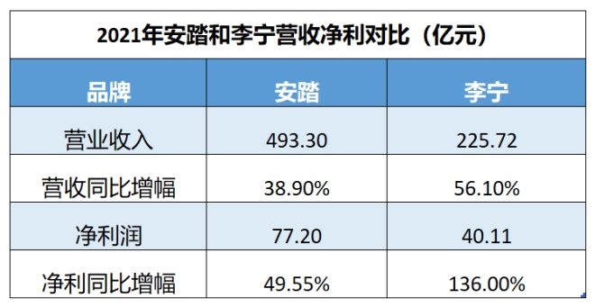 根据安踏和李宁最新2021年报显示,两者营收分别为:493.3亿元,225.72亿元。同比增幅为李宁56.1%,高于安踏的38.9%。在净利方面,安踏为77.2亿元,李宁为40.11亿元,远低于安踏。但是李宁在净利增幅方面,以高达136%的增速远高于安踏的49.55%,增速惊人。