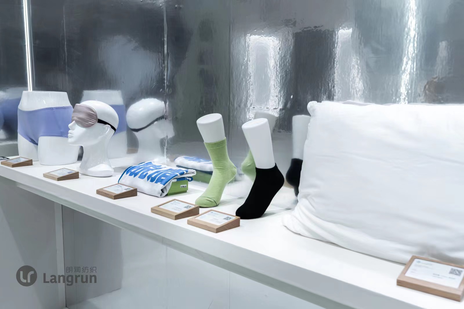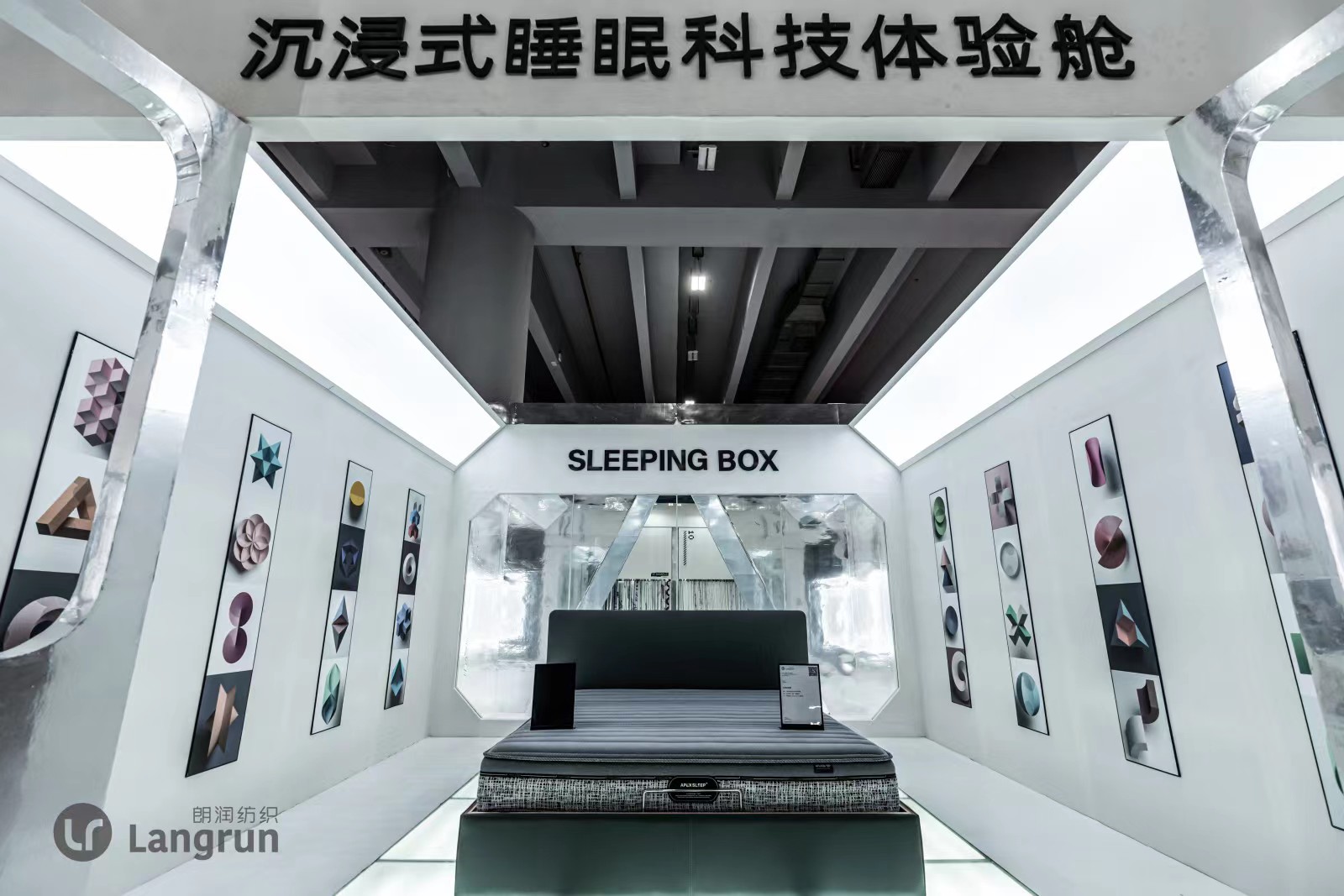 杭州朗润纺织有限公司沉浸式睡眠科技体验舱展示了不少纺织科技面料产品,包括:智能感应面料,以及生物钟标签、聚乳酸(PLA)等技术应用的眼罩、睡枕、抱枕、背包、内衣、袜子、口罩、床垫家纺面料、沙发面料、宠物用品等相关产品。