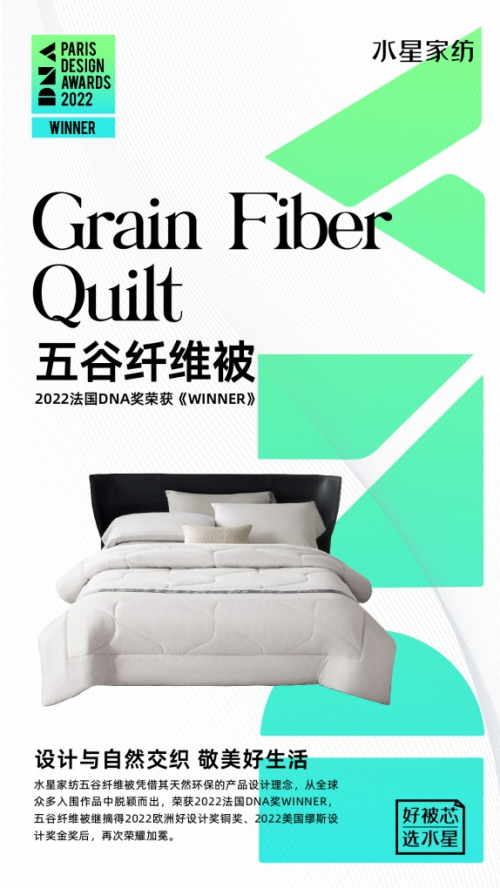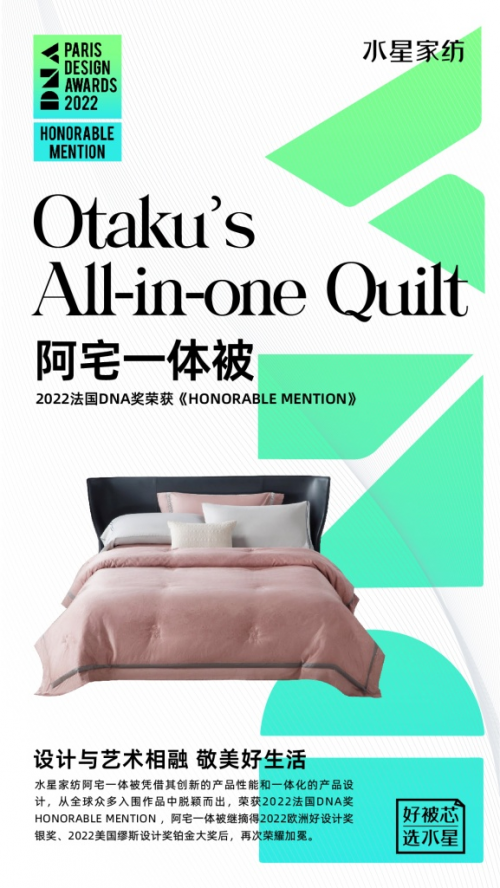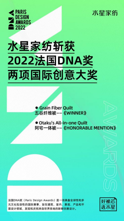 在本次赛事中,水星家纺旗下的“五谷纤维被”和“阿宅一体被”受到评选团的认可与称赞,其中五谷纤维被斩获“2022法国DNA奖——WINNER”,阿宅一体被斩获“2022法国DNA奖——HONORABLE MENTION”,向世界展示了中国品牌对人与自然关系的思考和对美好生活的探索。