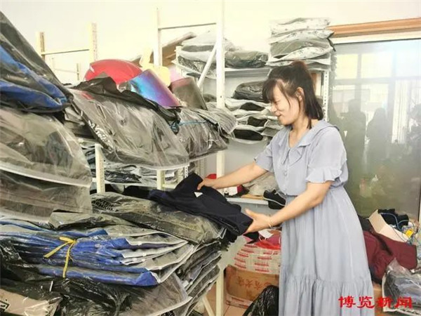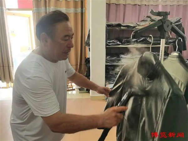 盛夏的骄阳热情似火,在淄川区将军路街道二里社区尚义路的一间门头房内,两名工人正在加紧整理男士皮衣和棉服,准备打包发货。