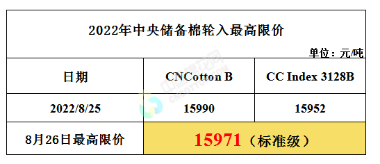 2022轮入|中央储备棉轮入最高限价(8月26日)