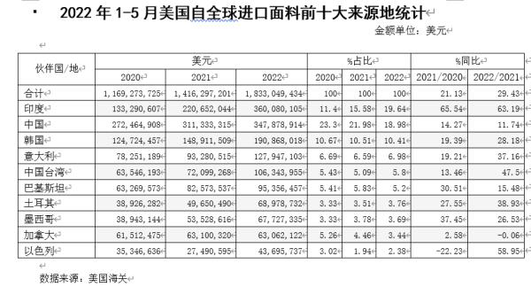 1-5月美国自全球进口面料前十大来源地一览