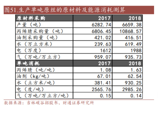 鉴于公司自 2019年下半年开展了丙烯腈贸易业务,因此这里只用 2017-2018年数 据测算单吨原丝生产的原材料及能源消耗,平均每吨原丝大约消耗 1.1-1.6 吨丙 烯腈、62.5-67kg 油剂、2566-2985 度电以及 0.14-0.15 万吨/万立方气。公司采购 的气主要包括蒸汽、氮气、压缩空气等。 2018-2020 年,公司毛利率先抑后扬,主要系产品结构调整。公司原主要生产小 丝束(1/3/6K)原丝,用于军工领域,售价和毛利率均高于民品,而中小丝束、 大丝束原丝主要用于高端装备、工业民用领域,市场需求量大于小丝束原丝。因 此,公司自 2016-2017 年开始研发大丝束产品,同时也丰富小丝束产品。公司新 产品定型完成后,产品质量和性能的提升是一个逐步的过程,客户对产品的认可 度也需要逐步提升。这使得公司毛利率水平 2017 年、2018 年波动较大。随着新 产品质量和性能提升,客户认可度,尤其是 2020 年以来产品处需求旺盛,2019 年、2020 年 1-6 月毛利率显著上升。