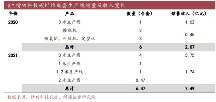 碳纤维制备工艺和设备对碳纤维的生产至关重要,其决定了碳纤维的产品质量, 由于碳纤维的制备工艺流程复杂,涉及工艺参数较多,积累这些参数往往需要很 长的周期,且国外领头企业对该类设备一直实施封锁禁售。因此,未来碳纤维 设备进口替代的需求巨大。 精功科技为国内碳纤维生产设备龙头企业,具备碳纤维成套生产线供应能力, 截至 2021 年公司已累计完成 6 条生产线交付。生产线以 12K、24K、48K 及以上 原丝为原料,具备年生产 1 千吨以上碳纤维生产能力,技术处于国际先进水平。 根据精功科技 12 月 16 日发布公告,2021 年 10 月 15 日公司与吉林国兴碳纤维签 署 4 条碳纤维生产线合同,金额总计为 6.5 亿元,即平均单条 3 米生产线含税价 约为 1.6 亿元。