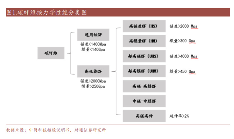 3)按力学性能分类:可以分为通用型和高性能型。通用型碳纤维强度为 1400MPa、模量在 140GPa 以下。高性能型碳纤维又分为高强型和高模型,其中 称强度大于 4000MPa 的为超高强型;模量大于 450Gpa 的为超高模型。