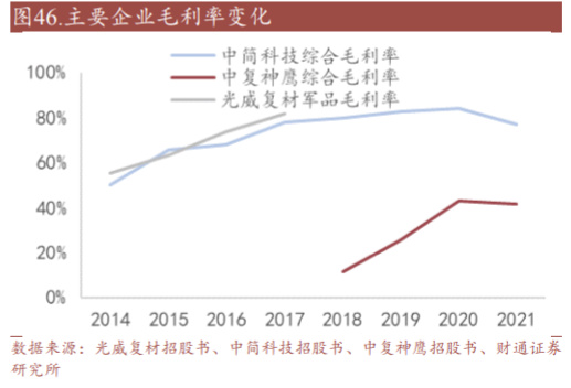 一方面,过去,我国由于技术瓶颈,生产线运行及产品质量极不稳定,导致“有 产能、无产量”的现象,但经历数十年发展与落后产能出清,目前我国碳纤维的 产能正在实现快速增长,产销率也在向国际水平靠拢,逐渐摆脱低产能利用率的 问题,规模化生产和良品率的提升,降低了单位产品的生产成本;另一方面,中 简科技、光威复材等企业军品销售占比较高,军品相比民品对于质量及稳定性、 良品率要求更高。如中简科技,随着军品订单的增加,在销售价格相对稳定的情 况下,规模化助力了单位成本的的下降。