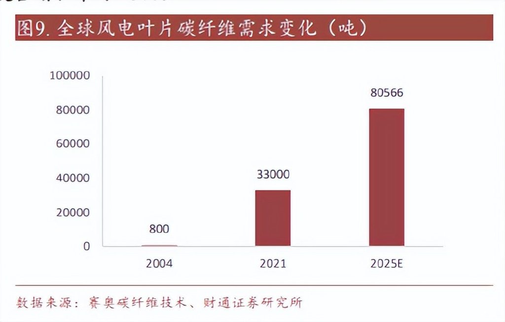 目前风电叶片市场上,玻纤与碳纤仍然存在一定竞争, 中 材 科技 发 布 SINOMA85.6 的全玻纤海上风电叶片并于 2020 年在福建兴化湾装机使用。2022 年 3 月,株洲时代最新发布的 TMT185 叶片,长达 91 米,全部使用玻璃纤维而 非碳纤维。碳纤维的减重优势非常明显,但在碳纤维供不应求的情况下,经济性 问题在一定程度上阻碍了在风电领域的应用。虽然如此,但总体上风电领域应用 前景依然光明,根据赛奥碳纤维技术预测,预计 2025 年全球风电叶片对碳纤维 需求将达到 8.06 万吨,复合增长率为 25%。