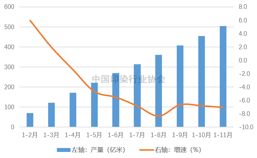 图1 2022年以来规模以上印染企业印染布产量及增速情况