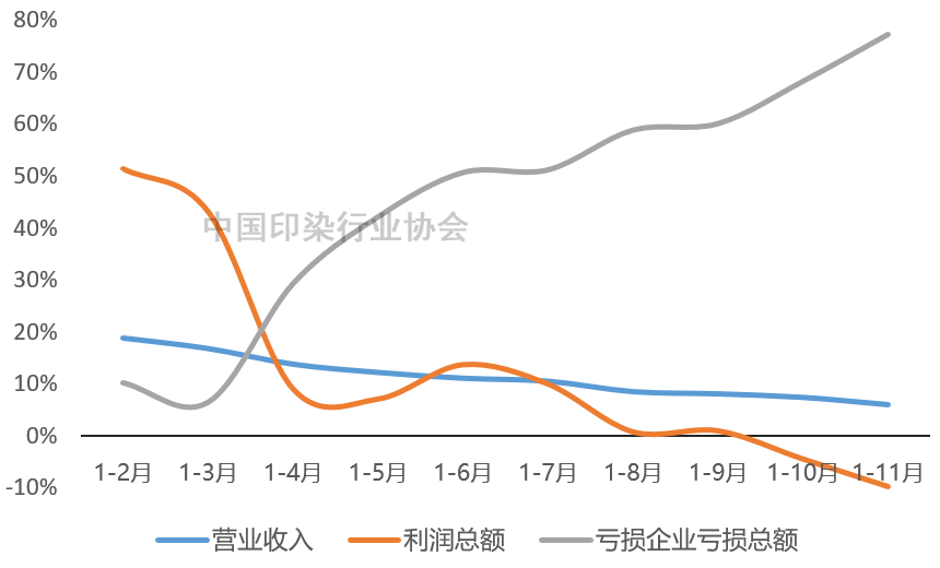 1-11月行业营业收入保持增长,但增速呈现“前高后低”态势。利润总额增速整体呈现下滑态势,1-11月利润总额增速降幅较1-10月扩大5.30个百分点,亏损企业亏损总额大幅增长,反映出在多重不利因素影响下,印染企业经营压力明显加大,行业运行效益有待改善。