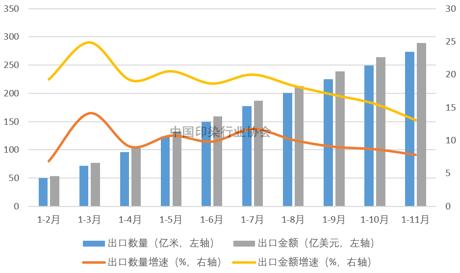 据中国海关统计数据,2022年1-11月印染八大类产品出口数量273.37亿米,同比增长7.83%,增速较1-10月回落0.84个百分点;出口金额289.32亿美元,同比增长13.09%,增速较1-10月回落2.46个百分点;出口平均单价1.06美元/米,同比提高4.88%。2022年我国印染八大类产品出口增速在1季度达到峰值后呈现波动下行态势,主要受世界经济下行影响,居民收入增长放缓,消费者实际购买力削弱,国际市场需求收缩态势逐步显现。