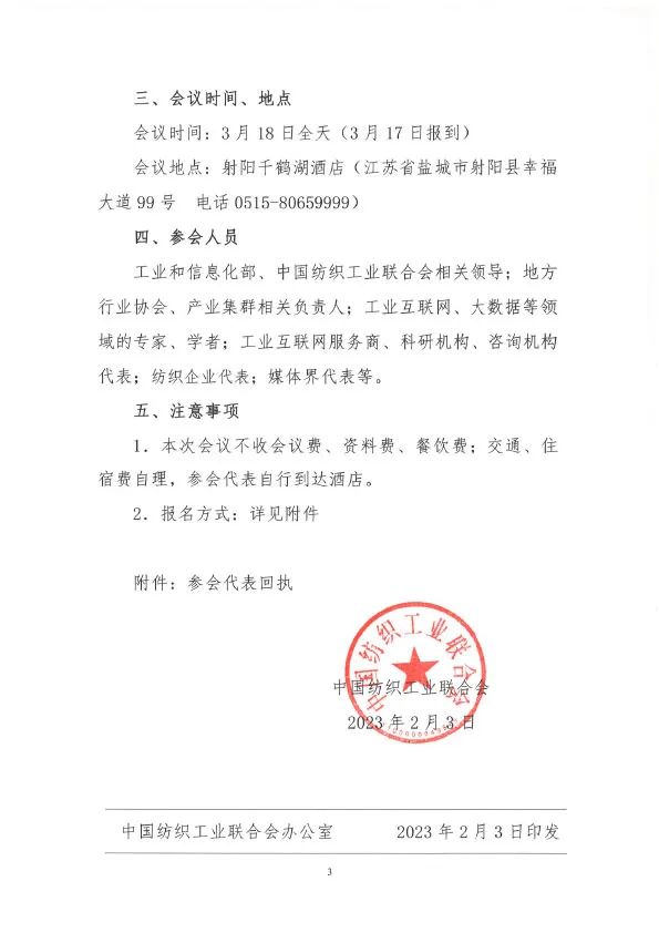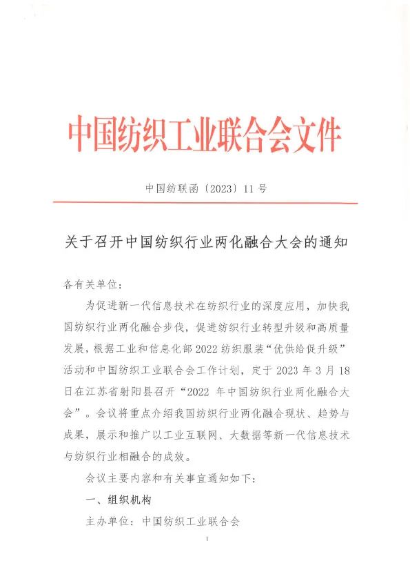 为促进新一代信息技术在纺织行业的深度应用,加快我国纺织行业两化融合步伐,促进纺织行业转型升级和高质量发展,根据工业和信息化部2022纺织服装“优供给促升级”活动和中国纺织工业联合会工作计划,定于2023年3月18日在江苏省盐城市射阳县召开“2022年中国纺织行业两化融合大会”。会议将重点介绍我国纺织行业两化融合现状、趋势与成果,展示和推广以工业互联网、大数据等新一代信息技术与纺织行业相融合的成效。