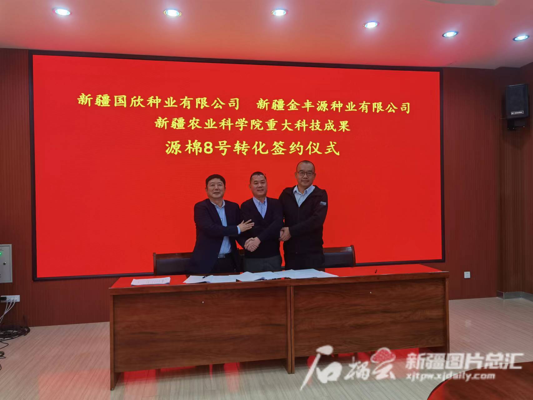 新疆农业科学院源棉8号签约现场。新疆农业科学院提供根据合作开发协议,新疆农科院和两家企业将进一步加强合作,新疆国欣种业有限公司、新疆金丰源种业有限公司将全权代理源棉8号的市场推广工作,新疆农科院将在良种繁育、良种良法配套、田间管理等方面为企业提供技术支持。
