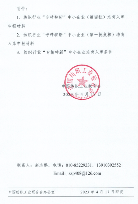 请各单位积极组织和推荐符合条件的企业申报。申报截止时间为2023年6月30日。纺织行业“专精特新”中小企业培育入库条件及申报材料见附件。申报材料由企业自行填报,无需任何中介机构,不收取任何费用。