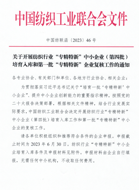 为贯彻落实关于“培育一批'专精特新’中小企业”、提升中小企业创新能力的重要指示精神,根据相关文件精神,结合行业发展实际要求,中国纺织工业联合会决定开展纺织行业“专精特新”中小企业(第四批)培育入库工作和第一批“专精特新”中小企业的复核工作。