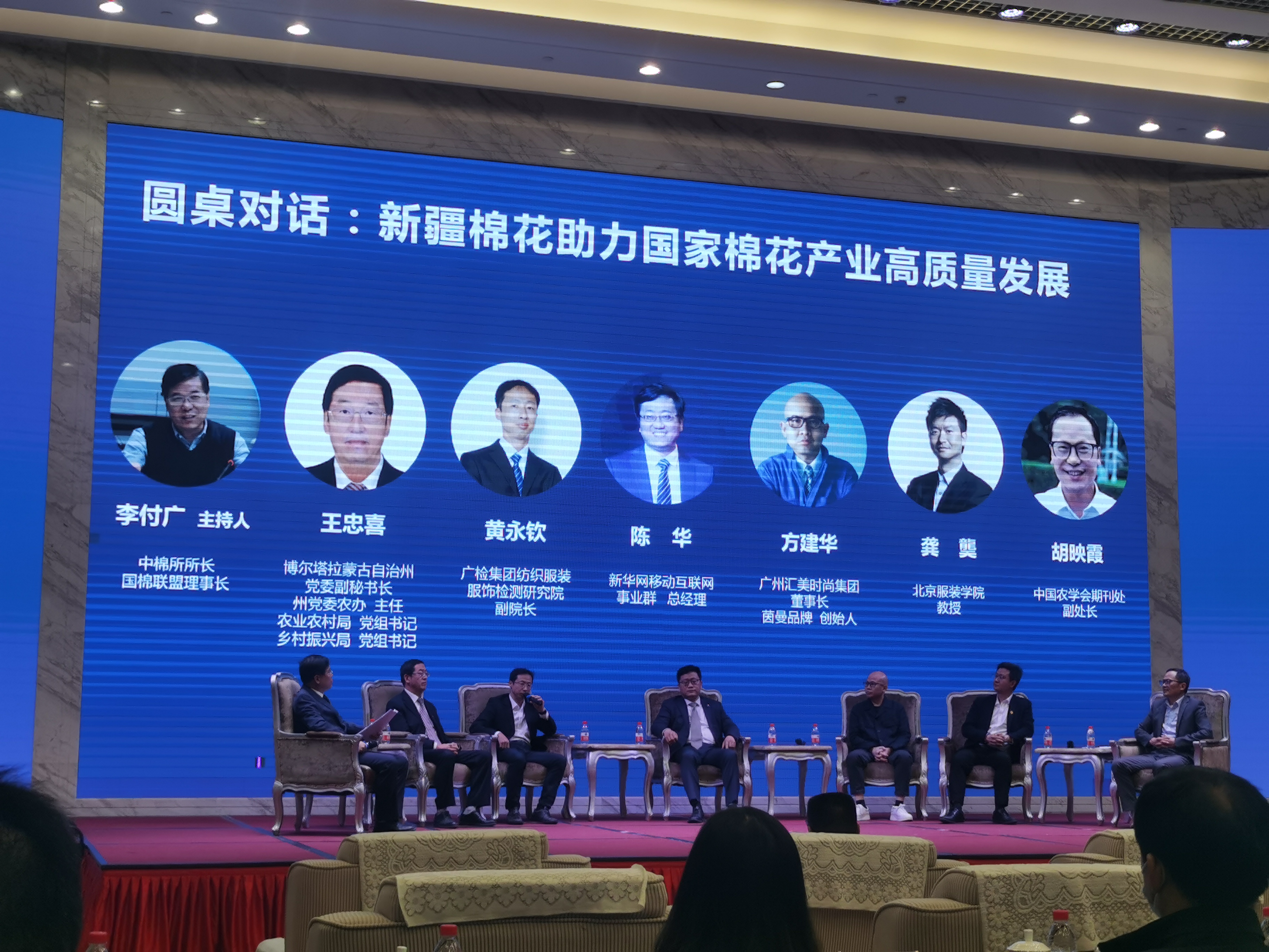 在圆桌对话交流环节,中国农业科学院棉花研究所所长、国家棉花产业联盟理事长李付广,农业农村部人力资源开发中心、中国农学会副处长胡映霞,新疆博尔塔拉蒙古自治州农业农村局党组书记王忠喜,广州市汇美时尚集团股份有限公司董事长、茵曼品牌创始人方建华,北京服装学院教授龚龑,广检集团纺织服装服饰检测研究院副院长黄永钦,新华网移动互联网事业群总经理陈华等行业专家、品牌企业家,就原始创新与人才如何助力新疆棉发展、新疆棉花质量提升如何面对市场需求、在时尚产品上如何更好的使用新疆棉、国棉国潮该如何深度融合高质量发展、如何加强溯源认证为全产业赋能增效、面对国际环境如何讲好中国棉花故事等话题,展开了一场精彩对话,共同探讨了新疆棉花助力国家棉花产业高质量发展的新趋势、新机遇、新思路。