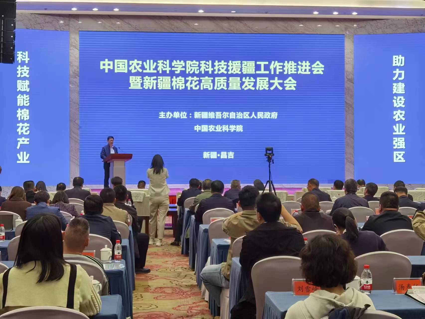 为深入贯彻中央第三次新疆工作座谈会精神,加快落实农业农村部全国农业援疆工作会议有关部署以及唐仁健部长“针对棉花生产方式、生产力布局和加工出口的实际需求,进一步加强棉花科技攻关和成果转化,提高产品品质和产业竞争力”的工作要求,推动新疆棉花高质量发展,促进国棉全产业链深度融合,由新疆维吾尔自治区人民政府、中国农业科学院主办,自治区农业农村厅、昌吉回族自治州人民政府、中国农业科学院棉花研究所、中国农业科学院西部农业研究中心承办,昌吉国家农业高新技术产业示范区、国家棉花产业联盟、新疆农业科学院、昌吉州农业投资开发(集团)有限公司协办的“新疆棉花高质量发展大会”在新疆昌吉成功召开。大会采取线上线下方式举行,由中国农业科学院副院长、党组成员梅旭荣主持。