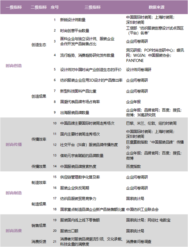 结合时尚的新定义、纺织服装产业的特征以及产业链关键环节综合考虑,最终形成由4个一级指标、8个二级指标、21个三级指标构成的中国时尚指数(产业)评估体系。
