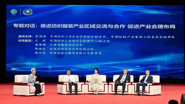 大会的最后环节是专题对话,中国纺织工业联合会检测中心副主任王政、江苏省服装协会会长龚慧娟、和龙边境经济合作区副主任陈绪东、珲春拉波尼服饰有限公司董事长陈开恩围绕“陆海联动 南北融通——推进纺织服装产业区域交流与合作,促进产业合理布局”的主题展开深入交流。中国纺织工业企业管理协会副会长、中国纺织工业联合会产业集群工作委员会秘书长张海燕主持。