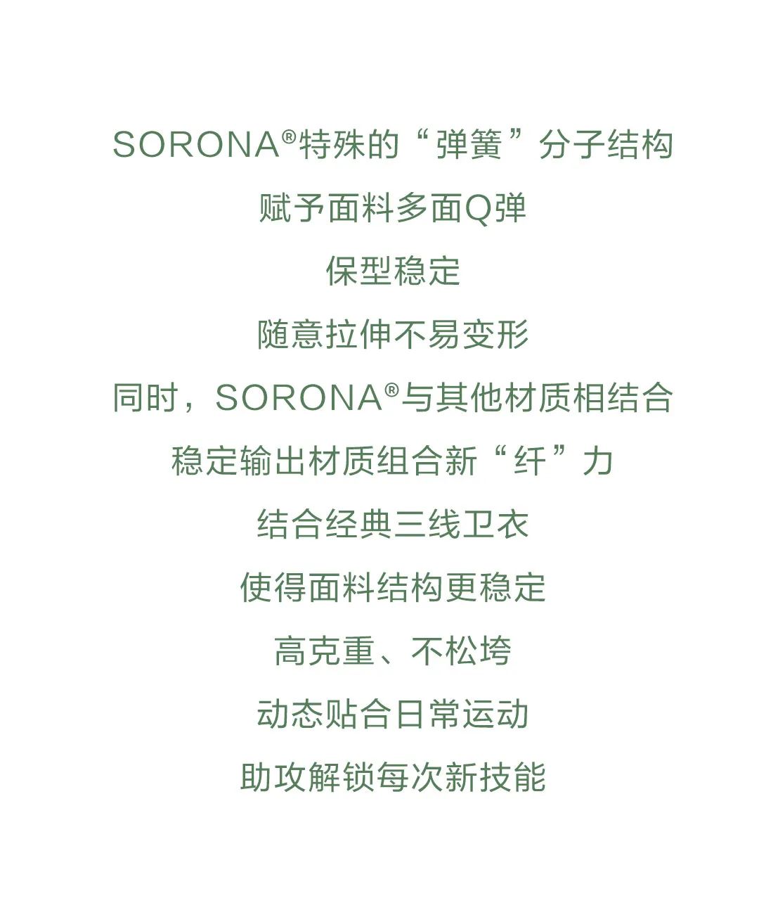 SORONA®是一项突破性的新型生物基聚合物解决方案,其核心原料来自每年可重复生长的植物。SORONA®不仅具有符合潮流趋势的可持续发展和环保主题,而且可以为纤维带来多种功能的优良特性。用SORONA®原料制成的纤维的“多功能性”为面料和服装设计师提供了更大范围的设计自由!