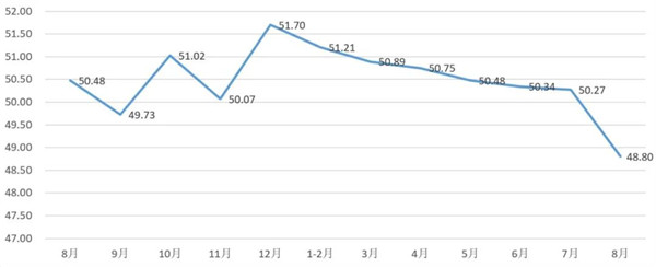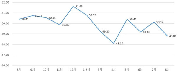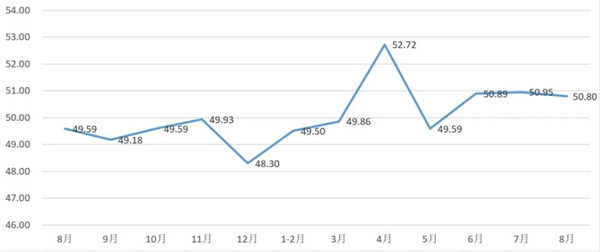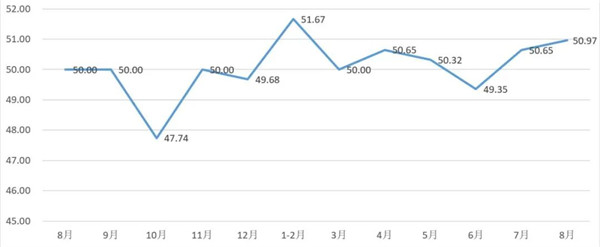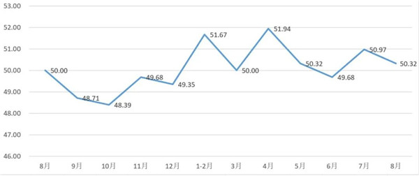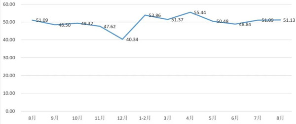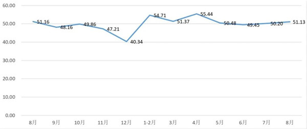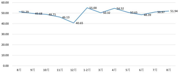 从管理者景气指数来看,总指数中,8月管理者景气指数为51.56,比7月的51.24上升0.32个百分点;经营环境指数为51.94,比7月的52.58下降0.64个百分点。