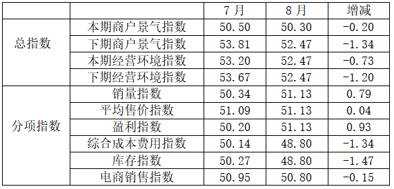 从商户景气指数来看,总指数中,8月商户景气指数为50.30,比7月的50.50下降0.20个百分点;经营环境指数为52.47,比7月的53.20下降0.73个百分点。
