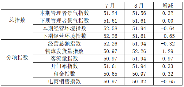 分项指数中,经营总额指数为51.94,比7月的52.26下降0.32个百分点;物流发货量指数为52.26,比7月的50.97上升1.29个百分点;客流量指数为51.94,比7月50.97上升0.97个百分点;开门率指数为51.94,比7月的51.61上升0.33个百分点;租金指数为50.97,比7月的50.65上升0.32个百分点;电商销售指数为50.32,比7月的50.97下降0.65个百分点。