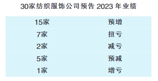 据上海证券报记者统计,截至1月30日,A股共有30家纺织服饰公司披露2023年度业绩预告,八成企业业绩预喜。具体来看,15家公司预增,净利润同比增长上限超100%的公司有7家;7家扭亏,2家减亏,预喜比例八成。整体来看,消费需求回暖、数字化生产与运营及品牌策略,成为纺织服饰公司业绩增长的主要驱动力。