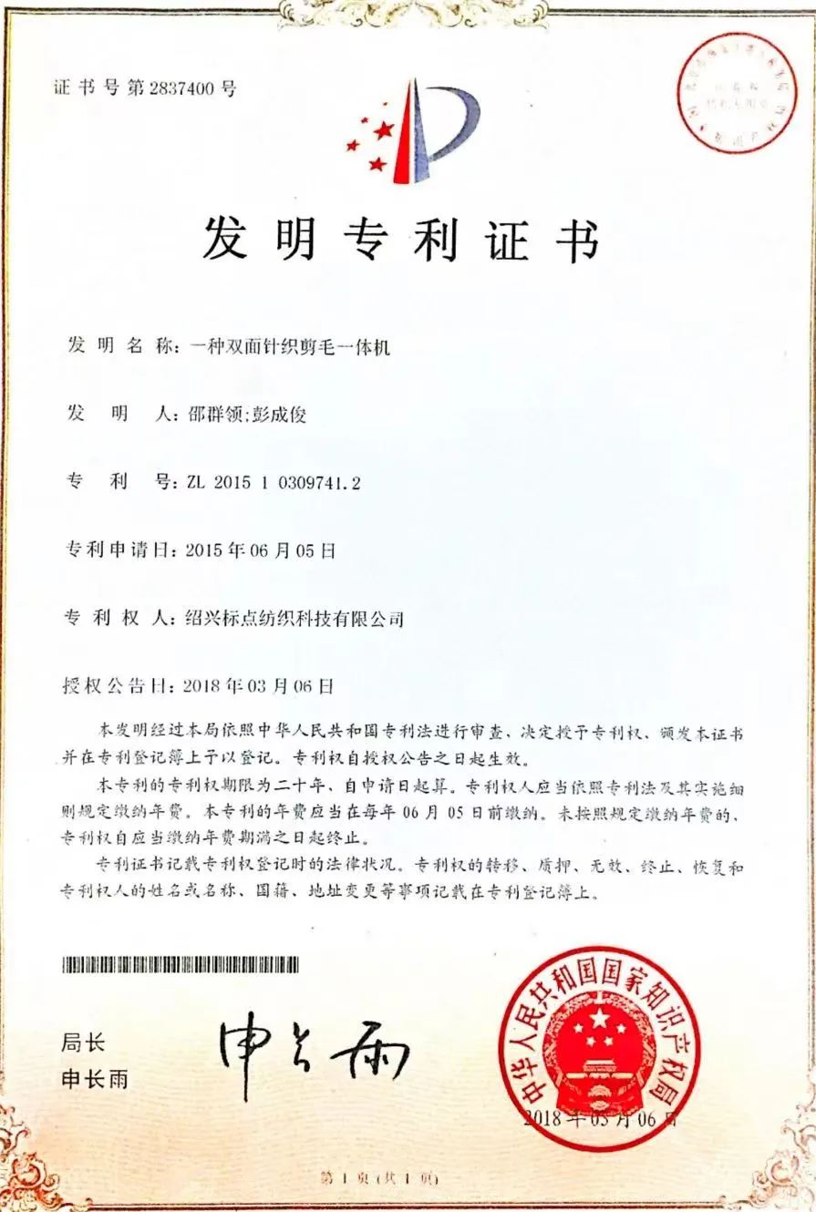 十年磨一剑,今朝现锋芒。如今的标点纺织在全行业率先实现“一洗一定一块绒”的极简毛绒面料工艺。公司自主研发的双面针织剪毛一体机,可改变现有技术中大圆机无法实现针织割绒一体下机及毛绒密度等问题,在织造端完成毛绒拉剪工序,有效降低原有后整理拉毛剪毛等工序产生的原料损耗和能源消耗。同时经该设备编织而成的毛绒面料,底部面料平整有风格,不用再与其他面料进行胶水粘合或缝合,可有效缩短后整理4-6个工序环节,减少污染及出错率,真正实现节能减排、降本增效,极简工艺、品质提升。