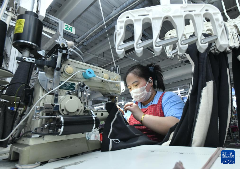 7月5日,河北省肃宁县一家服装生产企业的工人在赶制服装。