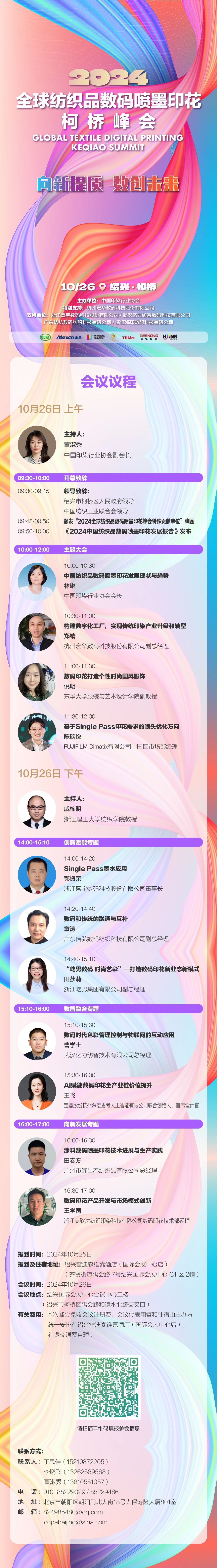 以数字技术赋能传统产业转型升级、催生新产业新业态新模式,是培育和发展新质生产力、加快建设现代化产业体系的必然选择。当前,数字技术在印染行业已得到广泛应用,数码喷墨印花作为具有全新时代特质与文化内涵的现代化生产力,顺应了数字化、高端化、绿色化、融合化发展新趋势,已成为培育产业发展新动能的重要力量。为进一步推动数码喷墨印花行业提质增效、向新发展,加快形成具有高效能、高技术和高质量特征的新质生产力,中国印染行业协会定于10月25-26日在柯桥召开“2024全球纺织品数码喷墨印花柯桥峰会”。