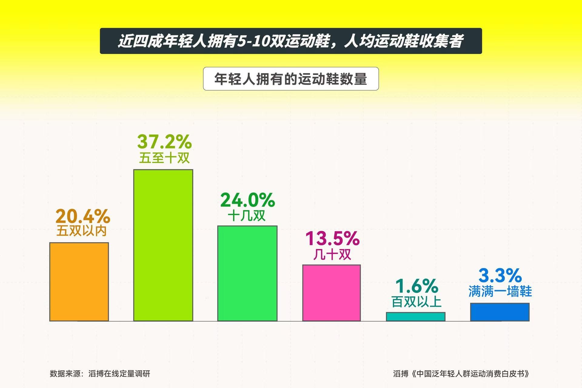 运动鞋对于年轻人来说,已经不仅仅是运动时的装备,还代表着一种健康自在的生活方式。年轻人热衷于购买运动鞋,调研数据显示,拥有5-10双运动鞋的年轻人占比37.2%;拥有十几双和几十双运动鞋的年轻人占比分别为24.0%、13.5%;20.4%的人十分克制,运动鞋数量在5双以内;1.6%的人拥有百双以上的运动鞋;3.3%的年轻人是狂热的运动鞋爱好者,他们的运动鞋可以覆盖满满一鞋墙,每双运动鞋都代表着他们独特的潮流态度。